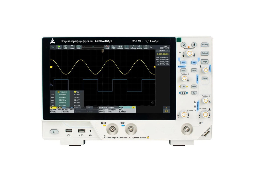 | Особенности | Скорость обновления экрана до 500.000 осц./сек, автоматические (43 параметра) и курсорные измерения. Математические функции, анализатор спектра БПФ. Декодирование протоколов UART/RS232 I2C SPI CAN LIN (опция). Вольтметр 4 разряда, частотомер 6 разрядов. Возможность питания от внешнего Power Bank 12В/4А (48 Вт), что позволяет трансформировать прибор в портативное средство измерения. Программное обеспечение на базе ОС Android. Дистанционное управление набором команд SCPI и WEB-сервера. |