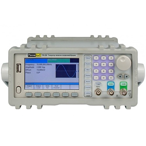 Генераторы сигналов специальной формы двухканальные ПрофКиП Г6-36 созданы для воспроизведения высокостабильных по частоте сигналов синусоидальной, прямоугольной, треугольной, импульсной формы, а так же шумового сигнала и напряжения постоянного тока. Генераторы воспроизводят так же сигналы произвольной формы, имея 50 заводских предустановок, и возможность программирования формы выходного сигнала оператором.