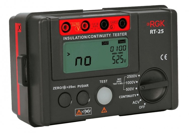 Электронный мегаомметр RGK RT-25 защищен от скачков напряжения по классу CAT III 600В и может применяться для замеров на коммутационном оборудовании, распределительных щитах, фидерах и трехфазных сетях.