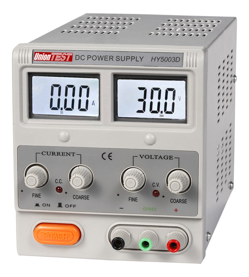 UnionTest HY5003D – источник питания, позволяющий получать регулируемое, точное и стабильное постоянное напряжение или постоянный ток. Две пары регуляторов грубой и точной настройки облегчают установку напряжения и тока, а цифровые жидкокристаллические индикаторы тока и напряжения упрощают считывание параметров выхода.