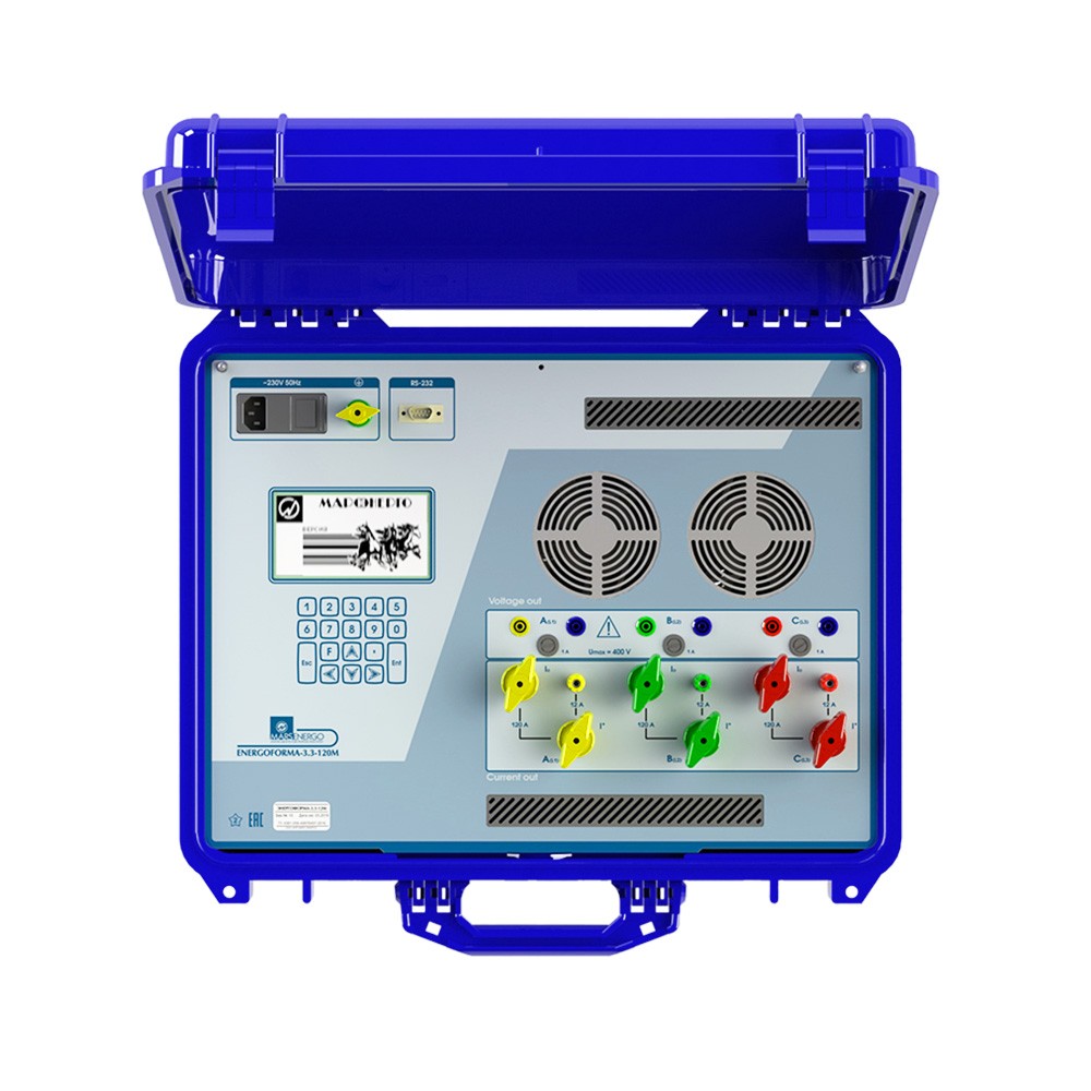 Переносной источник фиктивной мощности, переменного тока и напряжения трехфазный программируемый Энергоформа 3.3-120М осуществляет формирование трехфазной или однофазной системы токов и напряжений в соответствии с программируемой цифровой моделью сигнала при поверке СИ электроэнергии.